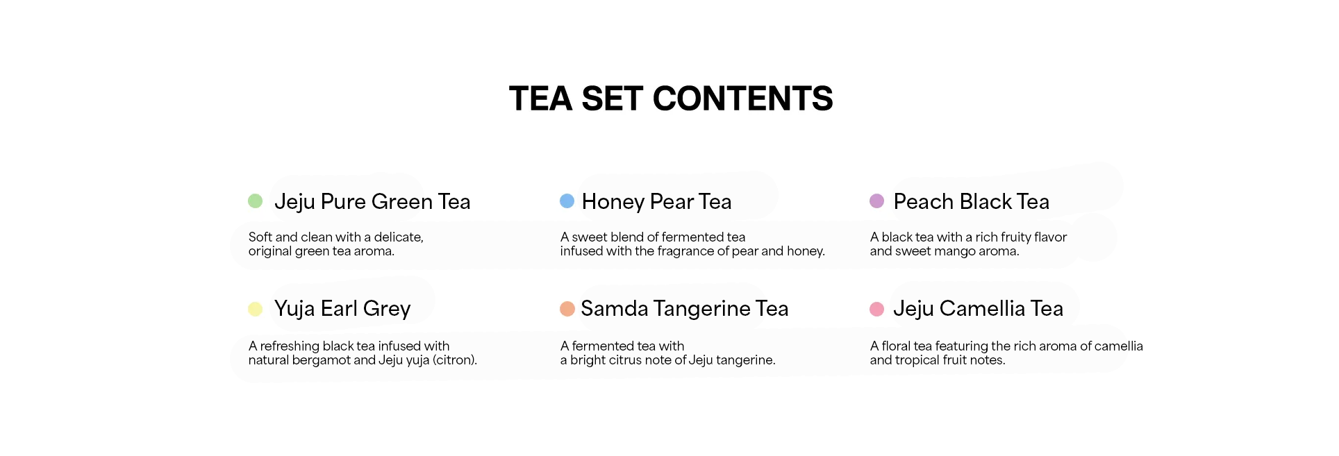 Fermented Tea (Jeju, Korea), Black Tea (Jeju, Korea), Sugar, Natural Flavor, Camellia Extract Powder (Jeju, Korea), Dried Camellia Petal (Jeju, Korea)